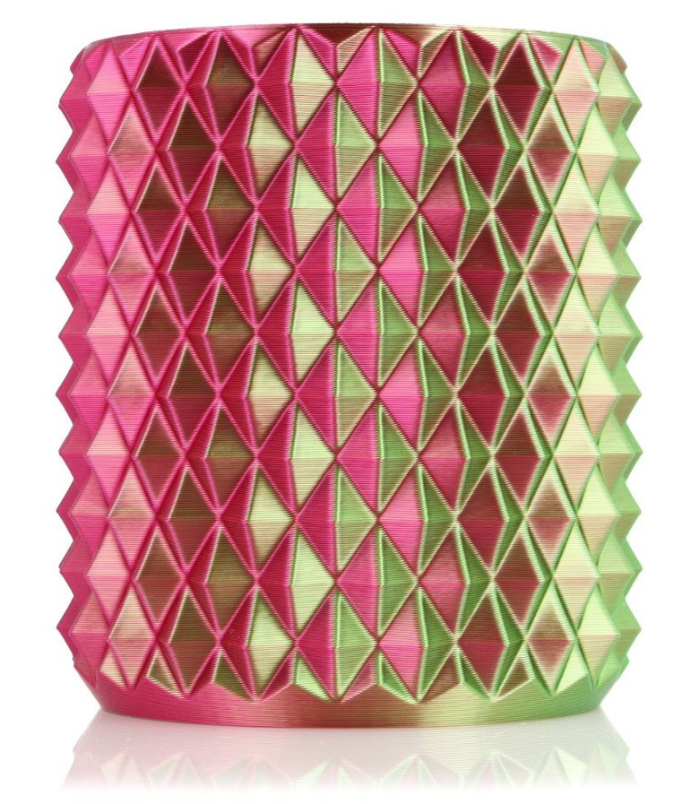 PLA Magic Silk Dragon Fruit combines two parallel colors in a single filament (green and fuchsia) as a result of the coextrusion process.