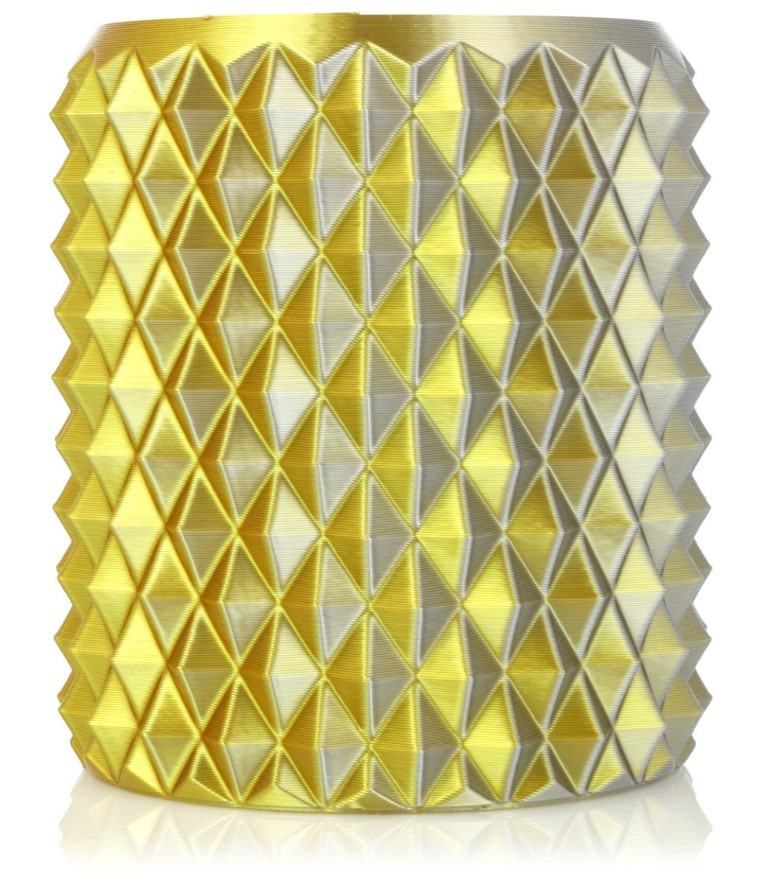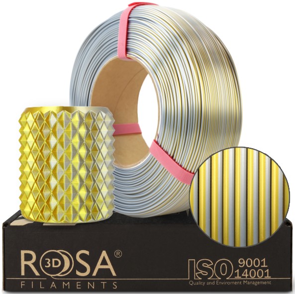 PLA Magic Silk Gold-Silver combines two parallel colors in a single filament (green and black) as a result of the coextrusion process.