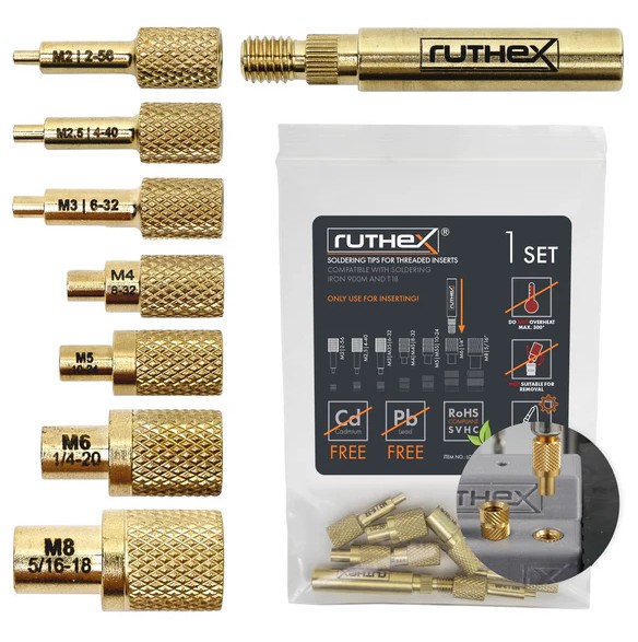🔧 PRACTICAL THREAD INSERT SET: The ruthex soldering iron tip set includes tips for metric ISO Includes thread inserts M2 / M2.5 / M3 / M4 / M5 / M6 / M8 and inch UNC thread inserts #2-56 / #4-40 / #8-32 / #10-24 / 1/4″ and a soldering iron Adapter The ideal temperature for insertion is 10-15 degrees above the hotend temperature of the 3D printing filament.
